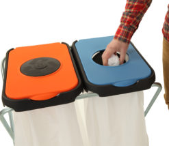 Dubbele opklapbare afvalzakhouder bestaande uit een gegalvaniseerd buizenframe en gekleurde kunststof deksels. In de klepdeksels zit een extra ronde inworpopening/ pushklep.