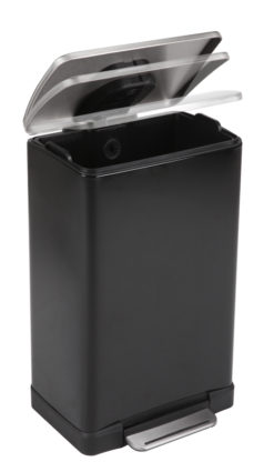 Stijlvolle rechthoekige pedaalemmer met extra breed pedaal, kunststof binnenemmer, gedempt deksel en stay-open functie. Aan de binnenzijde van het deksel is ruimte voor een carbonfilter om geurtjes te voorkomen. Fingerprint Proof.