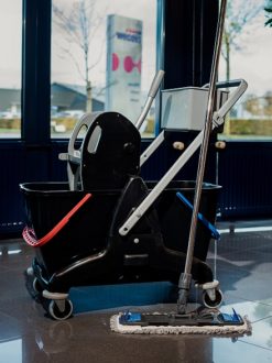 Een complete mopwagen die voor 75% bestaat uit gerecycled plastic van het merk Wecoline.